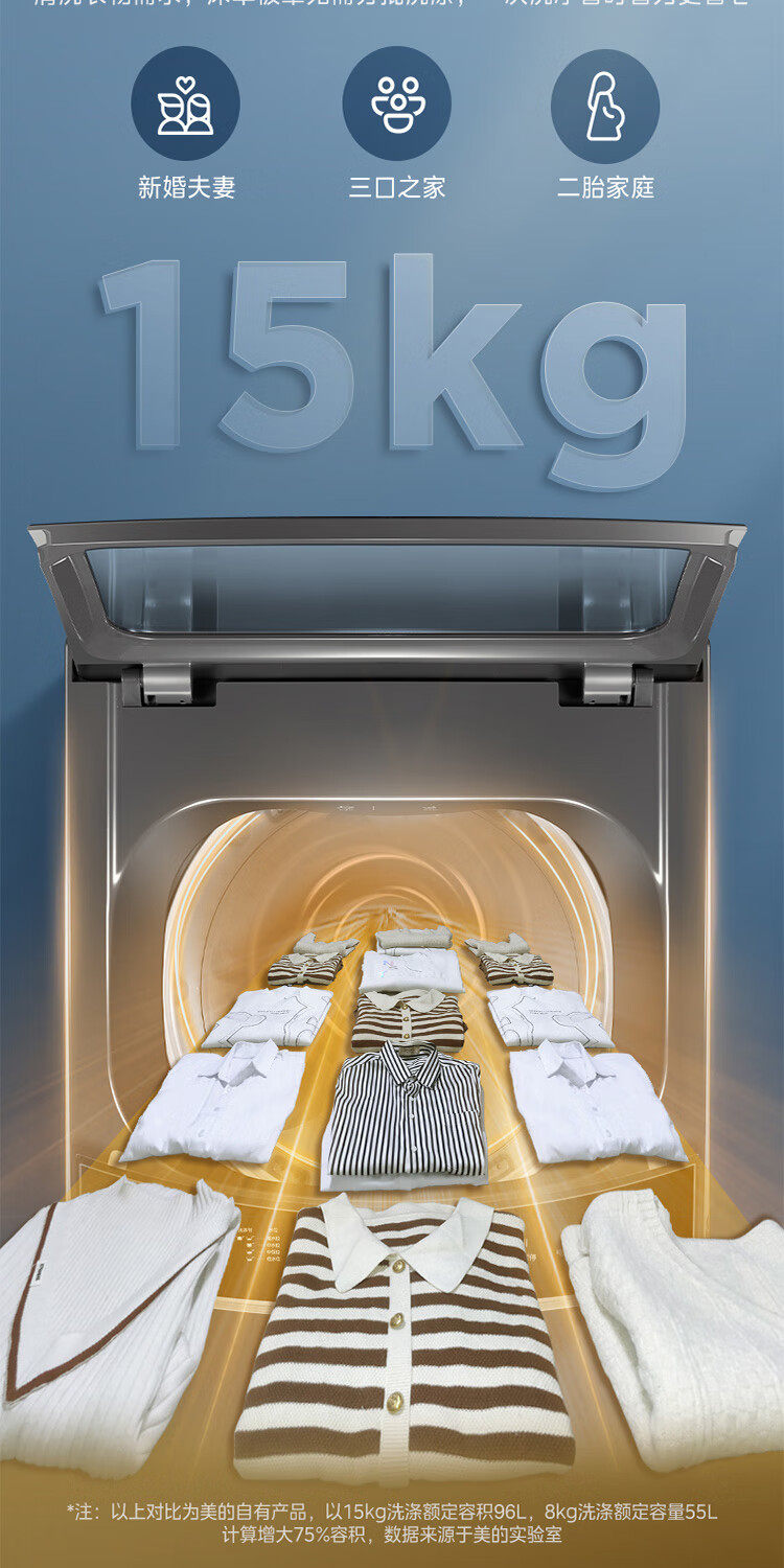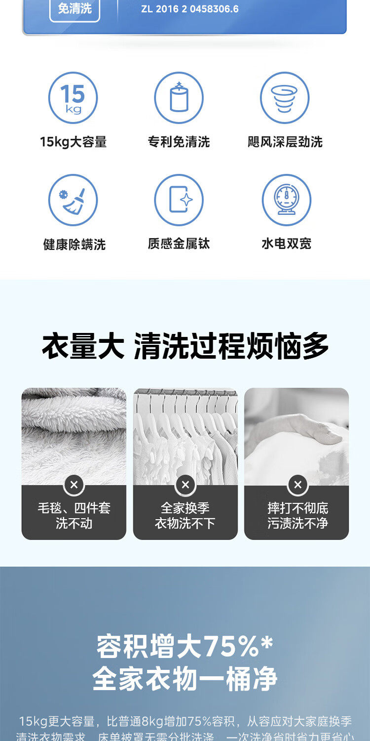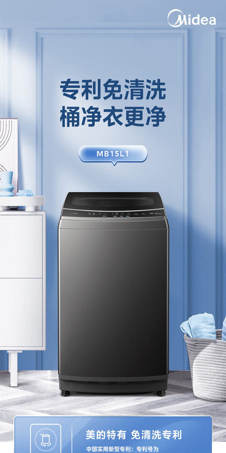 美的15公斤大容量免清洗健康除螨洗飓风净洗家用波轮洗衣机MB15L1