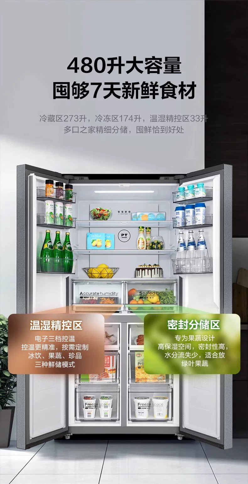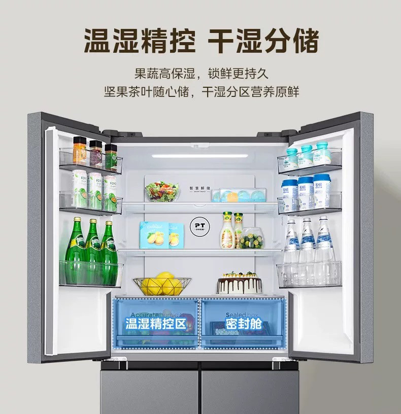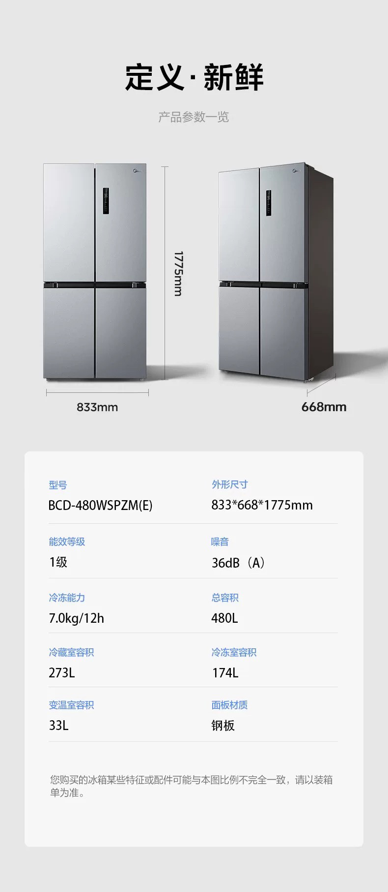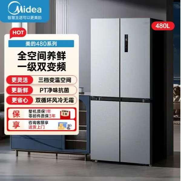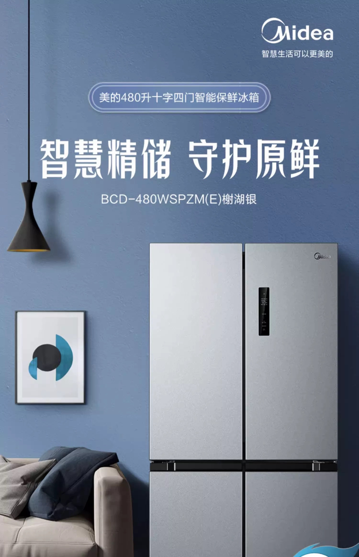 美的480升冰箱十字四开门变频一级超薄大容量风冷BCD-480WSPZM(E)
