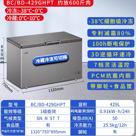 Haier/海尔 BC/BD-429GHPT商用家用大容量冰柜卧式冷藏冷冻转换