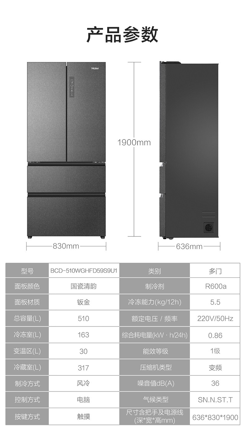 Haier/海尔 BCD-510WGHFD59S9U1嵌入双门对开门一级法式多门超薄