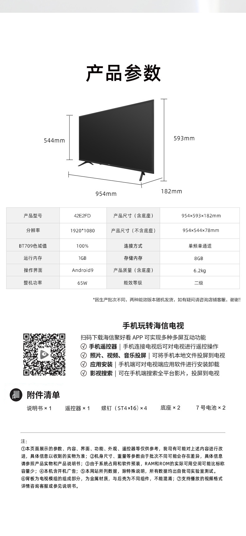 海信电视 42E2FD 42英寸 8G内存全高清WIFI智能超薄平板液晶电视