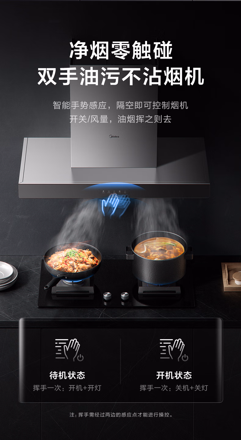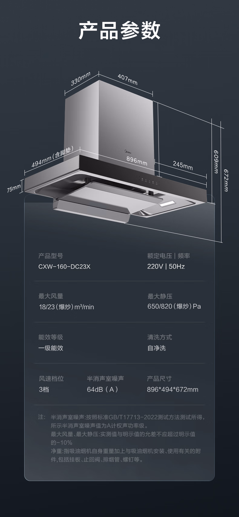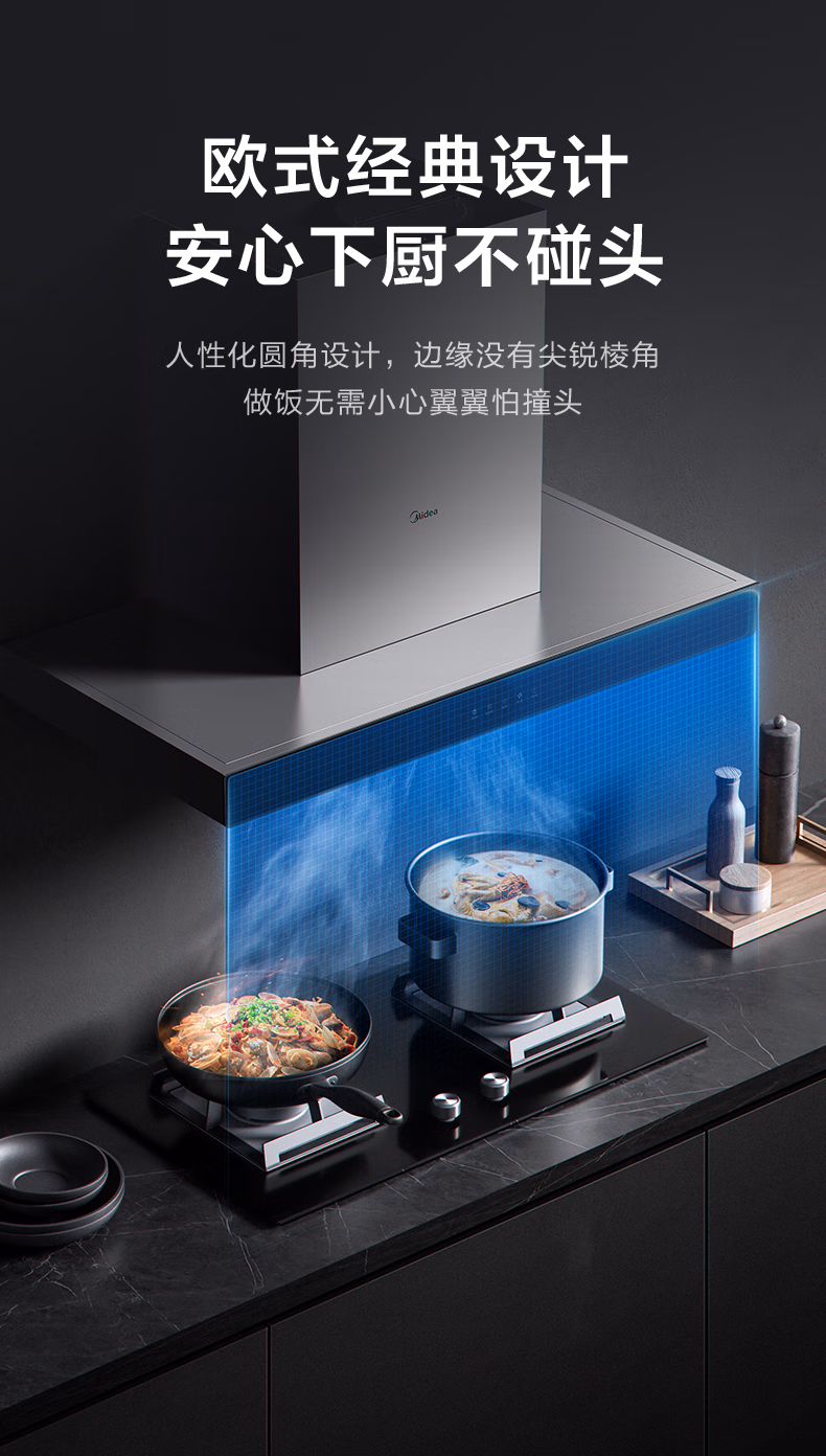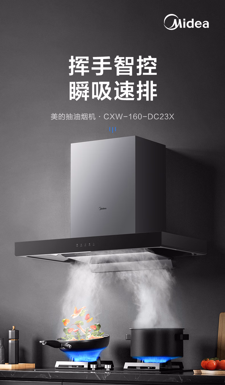 美的(Midea)抽油烟机大吸力顶吸式侧吸式大风量欧式抽油烟机T型按键智能节能省电家用 22立方CXW-160-DC23X