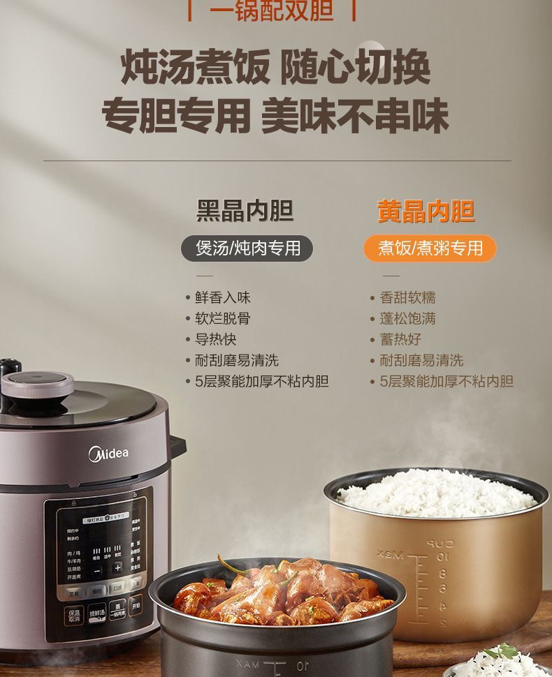 美的 MY-YL50M3-751 电压力锅祛腥提鲜5L微压排气一锅双胆